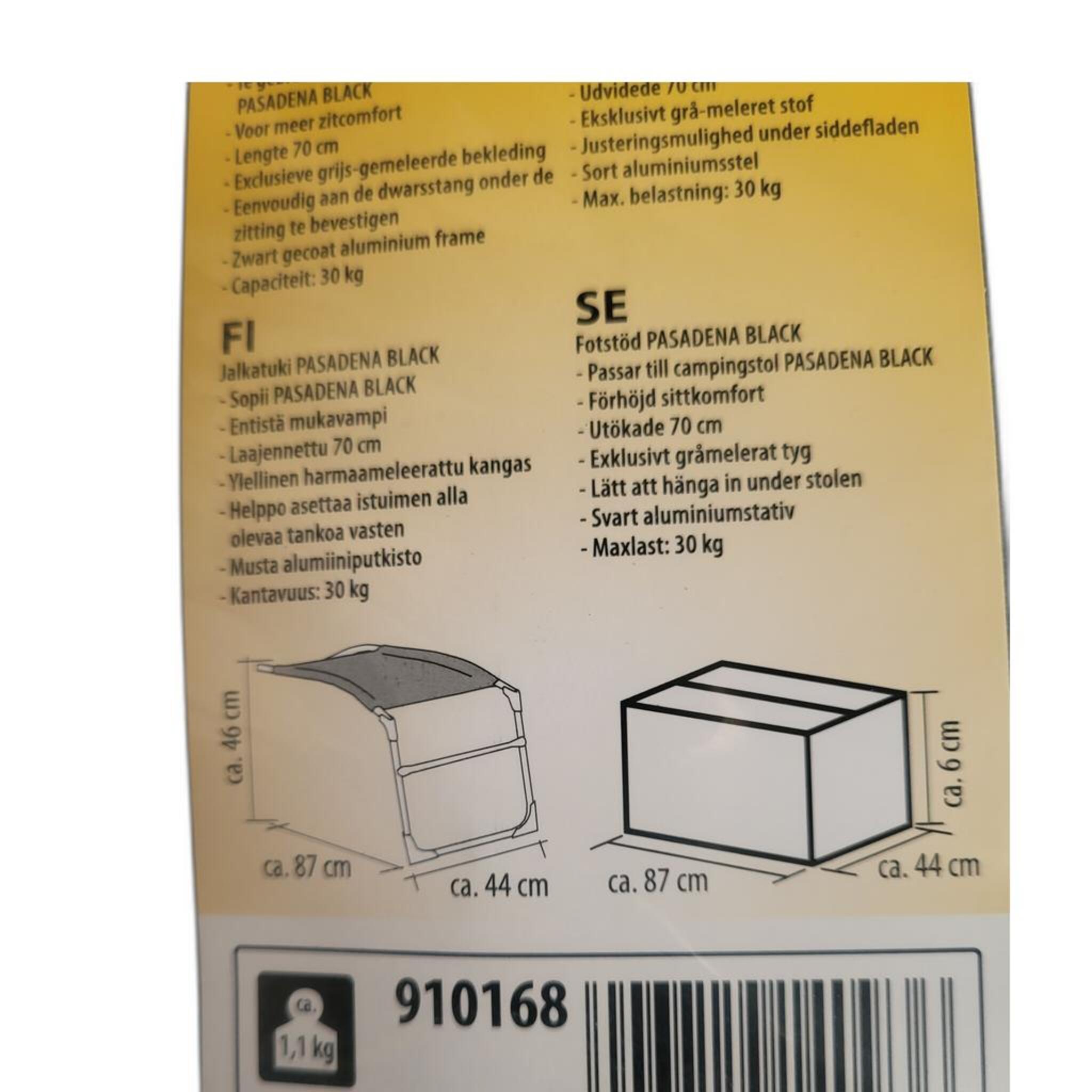 Sie können mit der Camp4 Beinauflage für den Stuhl Pasadena Ihren Sitzkomfort im Campingurlaub auf ein neues Level heben. Die Beinauflage ist speziell für den Stuhl Pasadena konzipiert und verfügt über ein robustes Gestell in elegantem Schwarz. Sie lässt sich einfach am Stuhl befestigen und sorgt dafür, dass Sie Ihre Beine entspannt hochlegen können. Genießen Sie so noch mehr Entspannung beim Campen oder beim Angeln am See.Herstellerinformationen: